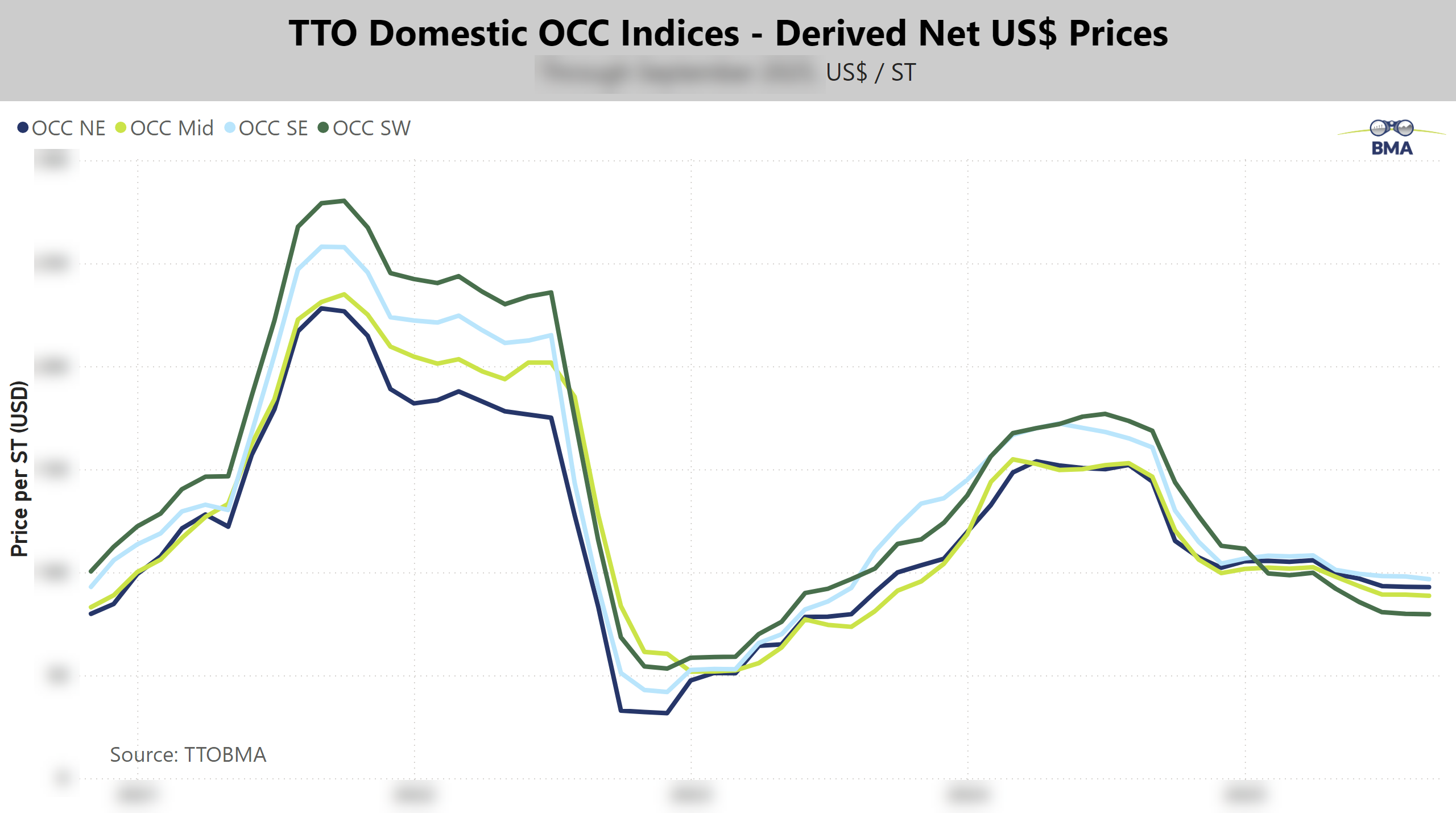 Monthly-updated, open-market, transactions-based, net-price indices for Mixed Paper (MP), Old Corrugated Containers (OCC), Sorted Office Paper (SOP), Light Print (LP), and Pulp Substitutes.